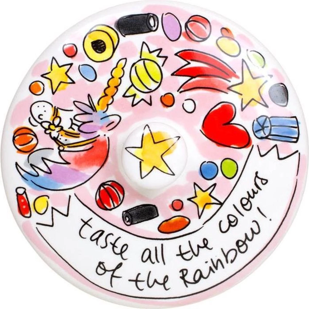 Dreams come true! Bewaar jouw favoriete snoep in deze kleurrijke voorraadpot. Op de voorraadpot staat een meisje met een unicorn afgebeeld en allerlei snoep in regenboogkleuren.